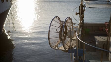 A moored fishing boat is waiting to set sail water while the sun reflects on the sea early in the morning with the winch of the fishing net in the foreground