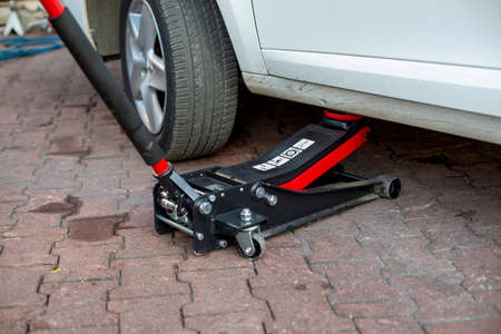 Hydraulic car jack lift the new car for change the tyre. Seasonal tyre change or service abstract concept.