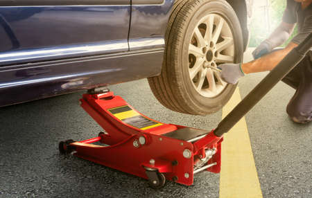 Red hydraulic floor jack ,Asia man with a blue car that broke down on the road.Changing tire on broken car on road