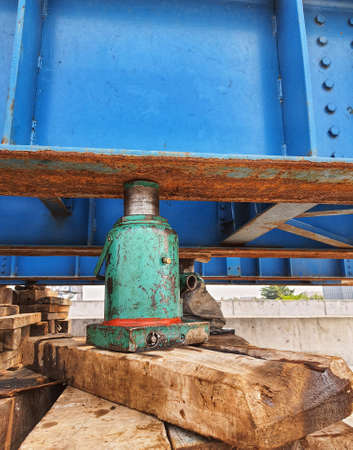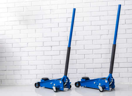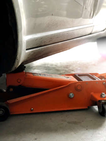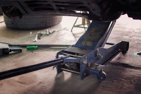 Hydraulic jack for lifting up car and vehicle in repairing garage workshop service center. Tool and equipment of automotive concept.