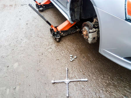 The hydraulic jack is installed under the car and lifting it. For repairing car wheel tire,tools place on ground