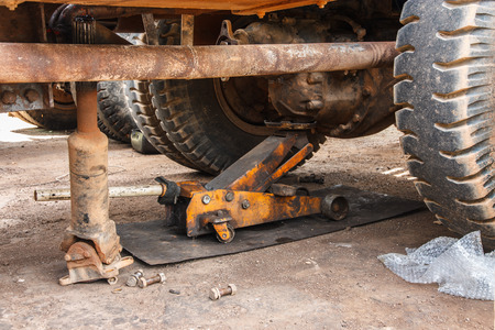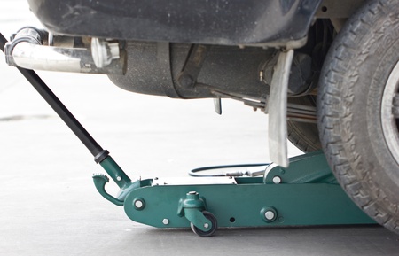Lifting a pickup truck with a hydraulic floor jack for servicing and maintenance in auto repair garage , Car maintenance concept