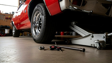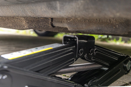 car maintenance with a small car jack at home, selective focus, and soft focus.