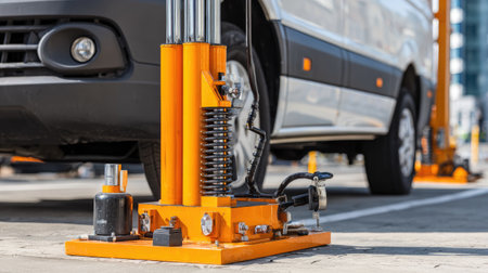This image showcases a hydraulic lift system in an automotive service center with a vehicle raised on the platform, highlighting repair tools and machinery.