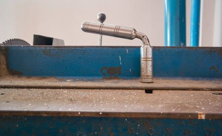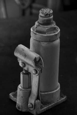 Hydraulic bottle jack left on the workbench in the basement of the house