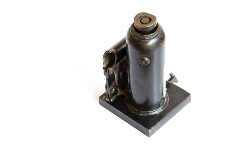 Old manual hydraulic car jack on a black background. Automotive hydraulic jack. Hand tool. Tire service. Car repair. Customer Service. Wheel replacement. Car mechanic tool. Place for text.