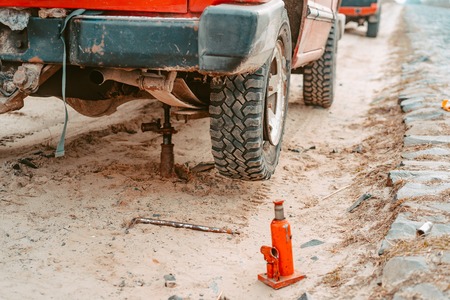 car wheel replacement. lifting the car with thelp of hydraulic jack.