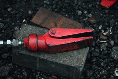 Detailed view of a red-handled lever and hydraulic equipment in an industrial workshop, highlighting machinery mechanics and engineering tools.