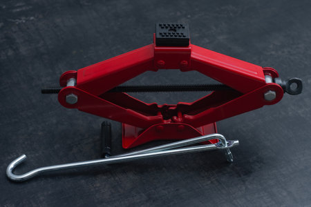 Close-up of a red car jack with a metal handle tool on a dark textured background. Concept of automotive repair, maintenance, garage tools and mechanical equipment