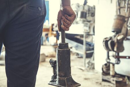 Hands using hydraulic jack - car maintenance concept. Car tire changed for maintenance in garage