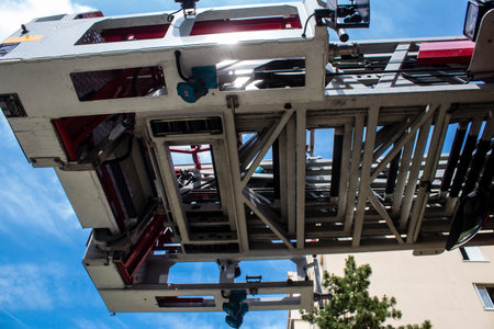 Reims, France - June 26, 2023 Firetruck of firefighters in intervention in a building on fire in Reims, France