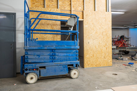 View of on working place with scissor lift. Construction work concept.