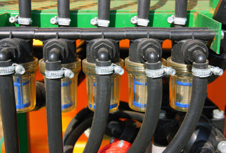 Agriculture equipment concept. Four hydraulic, pneumatic pipes on red machinery with plugs