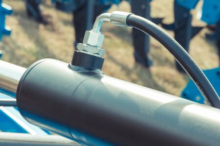 Agriculture equipment concept. Industrial detaild pneumatic, hydraulic black machinery made of steel.