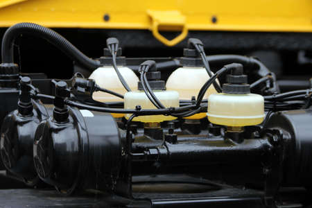 Pneumatic system hoses of modern heavy machine. Industrial machinery. Technology. Agriculture equipment.