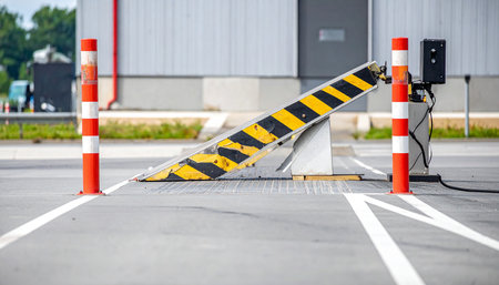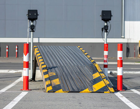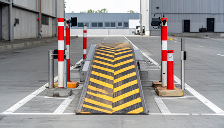 A yellow and black striped industrial vehicle access ramp with cameras and red and white bollards in an outdoor paved area.