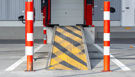 An inclined loading dock ramp with prominent yellow and black hazard stripes is surrounded by red and white bollards and industrial lighting sensors.