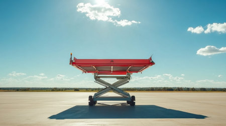 A bright red scissor lift positioned on an airport runway against a clear blue sky and scattered clouds, showcasing ideal conditions for maintenance and construction work.