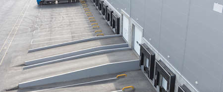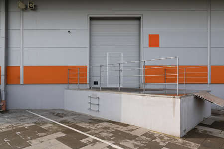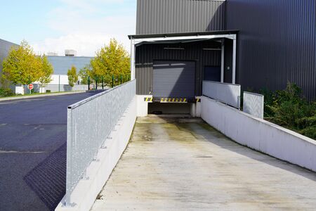 A loading dock ramp with yellow and black hazard stripes is flanked by red and white striped bollards in front of an industrial building.