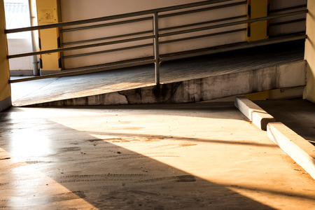 golden sunlight shining to empty car parking garage with tire tracks on ground