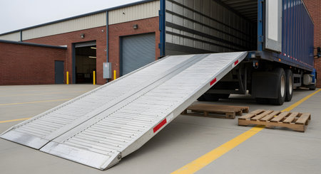 An empty aluminum loading ramp is extended from the back of a semi-truck trailer down to the pavement of a loading bay. The scene is set outside a brick warehouse with roll-up doors, ready for loading or unloading cargo.