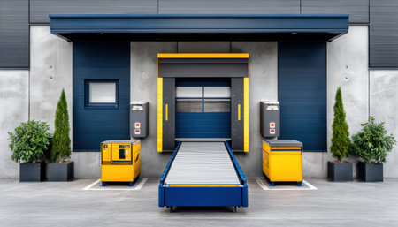 Logistics storage solutions modern loading dock with conveyor and yellow safety equipment creating efficient warehouse workflow and organized
