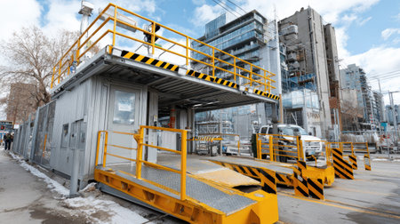 An industrial loading dock features bright yellow safety barriers and ramps, set against a backdrop of construction buildings and a clear sky.