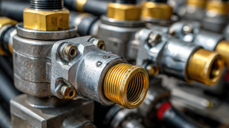 This close-up image features an industrial valve with a brass fitting, highlighting essential pipeline components in a machinery setting, emphasizing functionality.