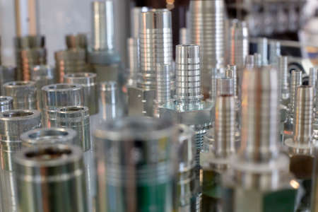This close-up image features industrial metal fittings and connectors arranged on a dark surface. The soft lighting highlights the precision threading and metallic sheen, enhancing the visual appeal of the mechanical parts.