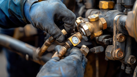Close-up of a mechanics gloved hand adjusting a part of an engine, highlighting maintenance and repair work.