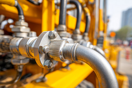 Detailed close-up of industrial hoses and connectors used in heavy machinery, showcasing the intricate design and construction tools in a busy construction environment.