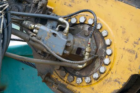 Close up view of hydraulic pipes of heavy industry machine. Low key. Hydraulic maintenance concept.
