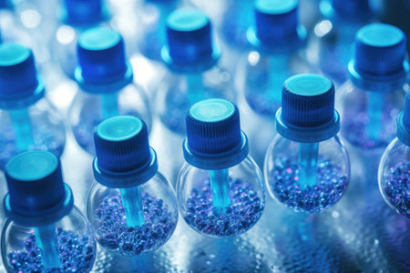 A collection of glass bottles filled with vibrant blue liquid. Soft lighting enhances the glowing effect, highlighting the bubbles, evoking a modern scientific ambiance.