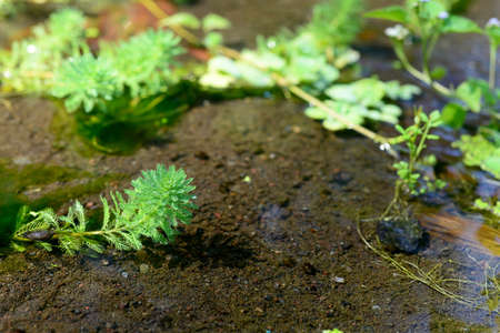 Myriophyllum aquaticum plant is in a river with clear water flow
