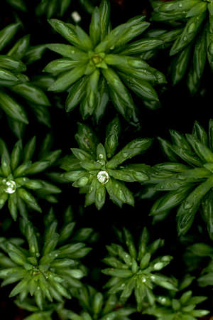 Beautiful green spring background with moss and dew drops