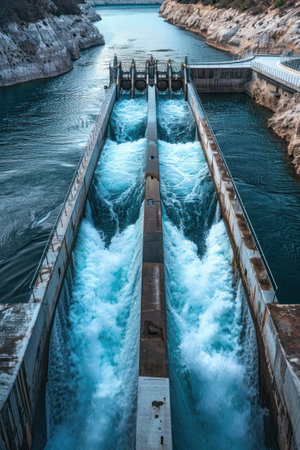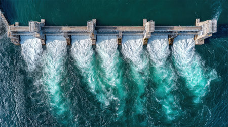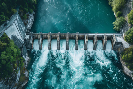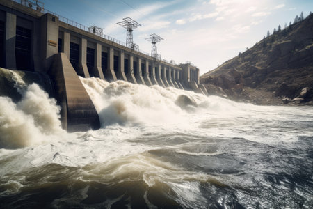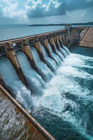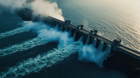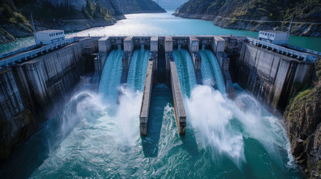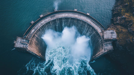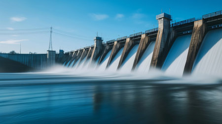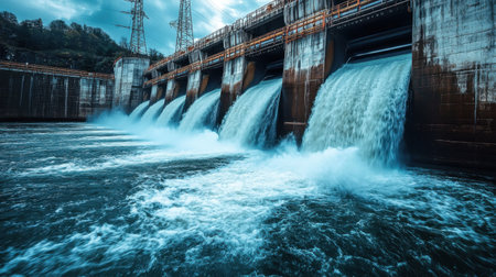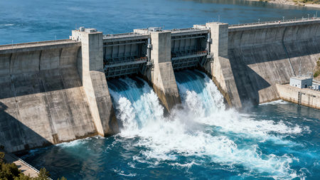 A hydroelectric dam is seen releasing a torrent of water, demonstrating sustainable energy generation and water management
