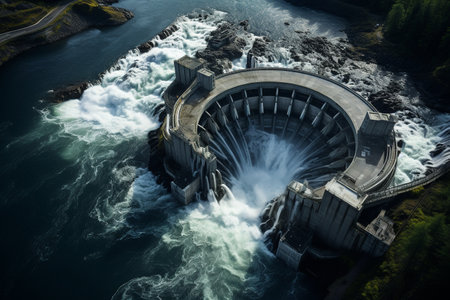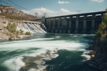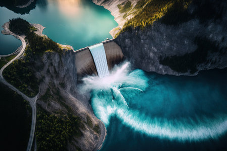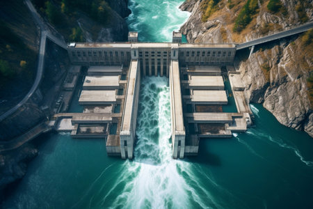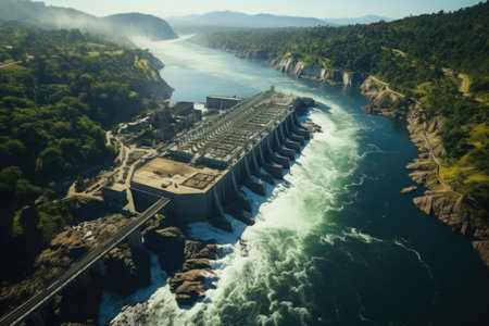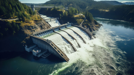 Generative AI, hydroelectric dam utilizing the flow of water to produce sustainable energy, power station, aerial view