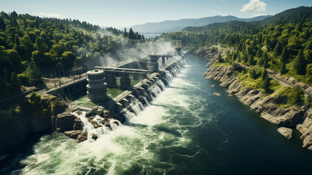 Hydroelectric power station generates electricity from flowing water and nature generated by artificial intelligence