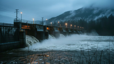A serene dam at twilight, showcasing flowing water and illuminated gates amidst a misty, tranquil landscape.