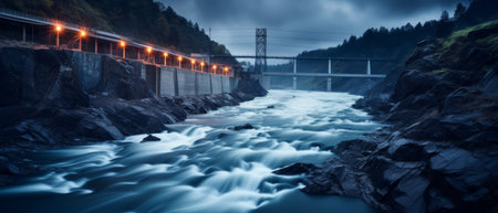 Long exposure of a river flowing through a hydroelectric power site, emphasizing continuous and clean energy production in a natural setting,