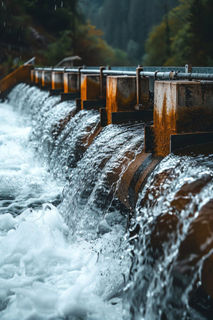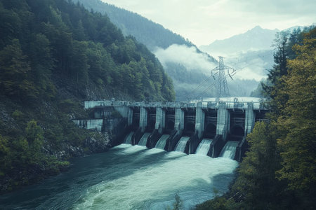 A hydroelectric dam nestled in a verdant landscape, water flows through the dam generating clean energy.