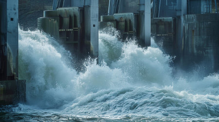A close-up of water rushing through spillway gates of a dam, a powerful display of hydraulic engineering and controlled water release.