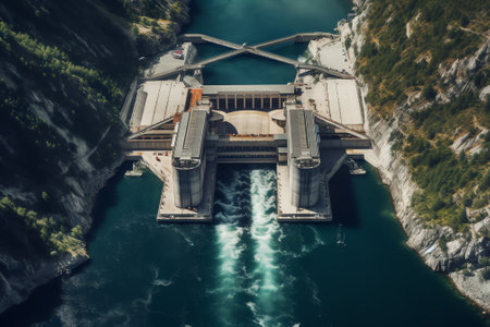 Aerial view of a modern hydroelectric power station harnessing renewable energy from flowing water. Concept Renewable Energy, Hydroelectric Power, Aerial View, Modern Infrastructure