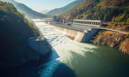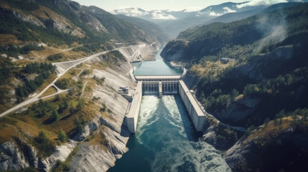 A hydroelectric dam generates power amidst a picturesque mountain landscape, showing the power of nature harnessed for sustainable energy.