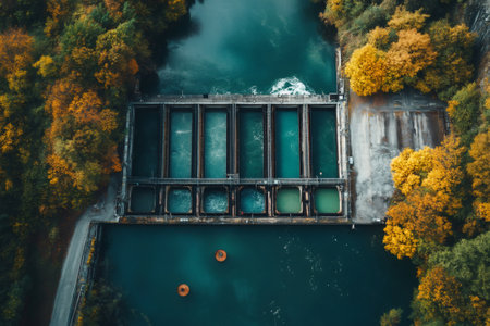 An aerial view of a hydroelectric dam showcases the interplay of water and nature. Surrounded by autumn foliage, this image highlights renewable energy and engineering marvels.