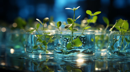 Plants in glass bottles in the laboratory. Biotechnology concept.