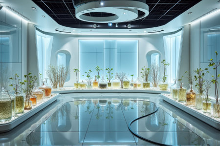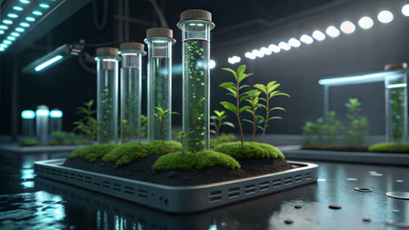 Futuristic Plant Science Laboratory with Test Tubes and Moss, Enhanced Lighting