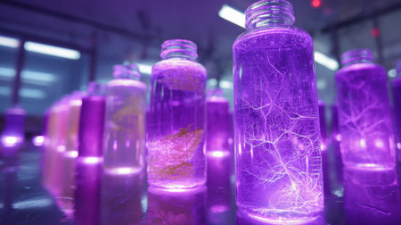 A collection of glass bottles filled with vibrant blue liquid. Soft lighting enhances the glowing effect, highlighting the bubbles, evoking a modern scientific ambiance.