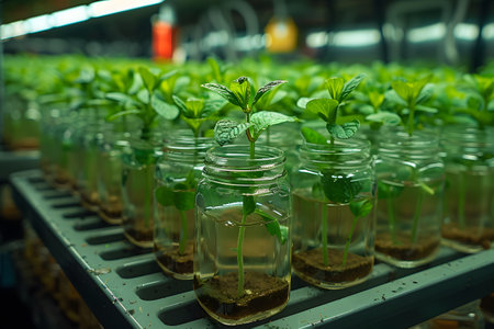 Close up row of glass bottle plant tissue culture on shelf in laboratory