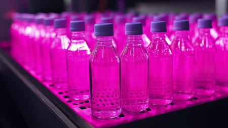 Juice production process with vibrant pink lighting in an indoor facility setting